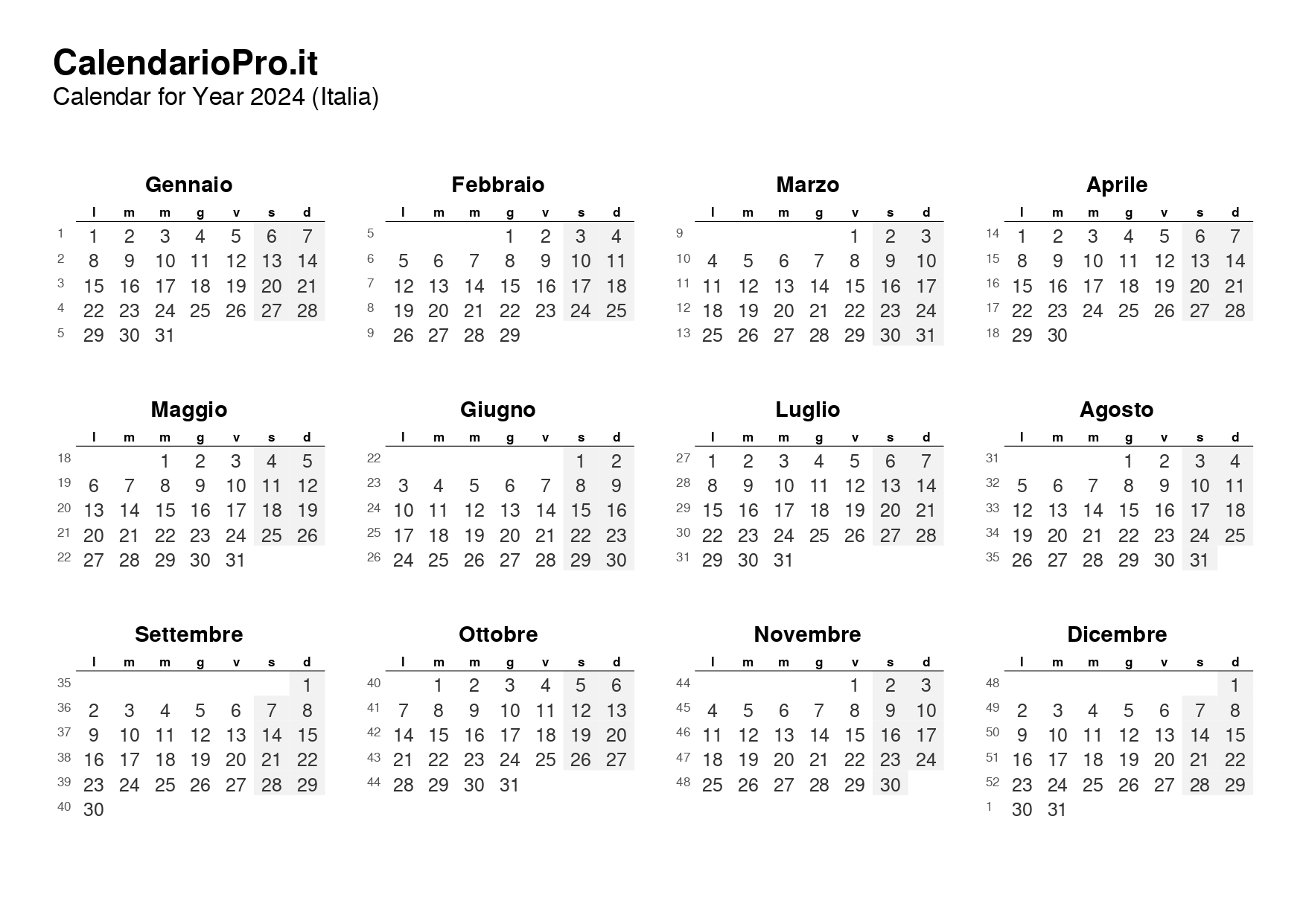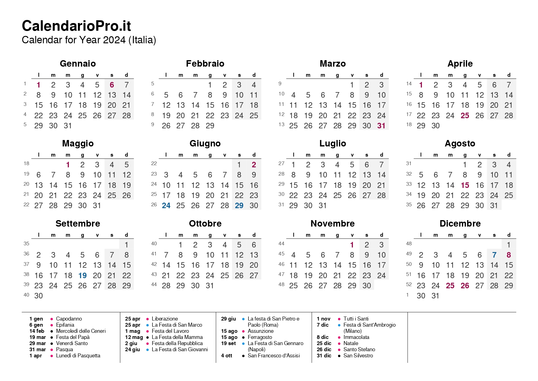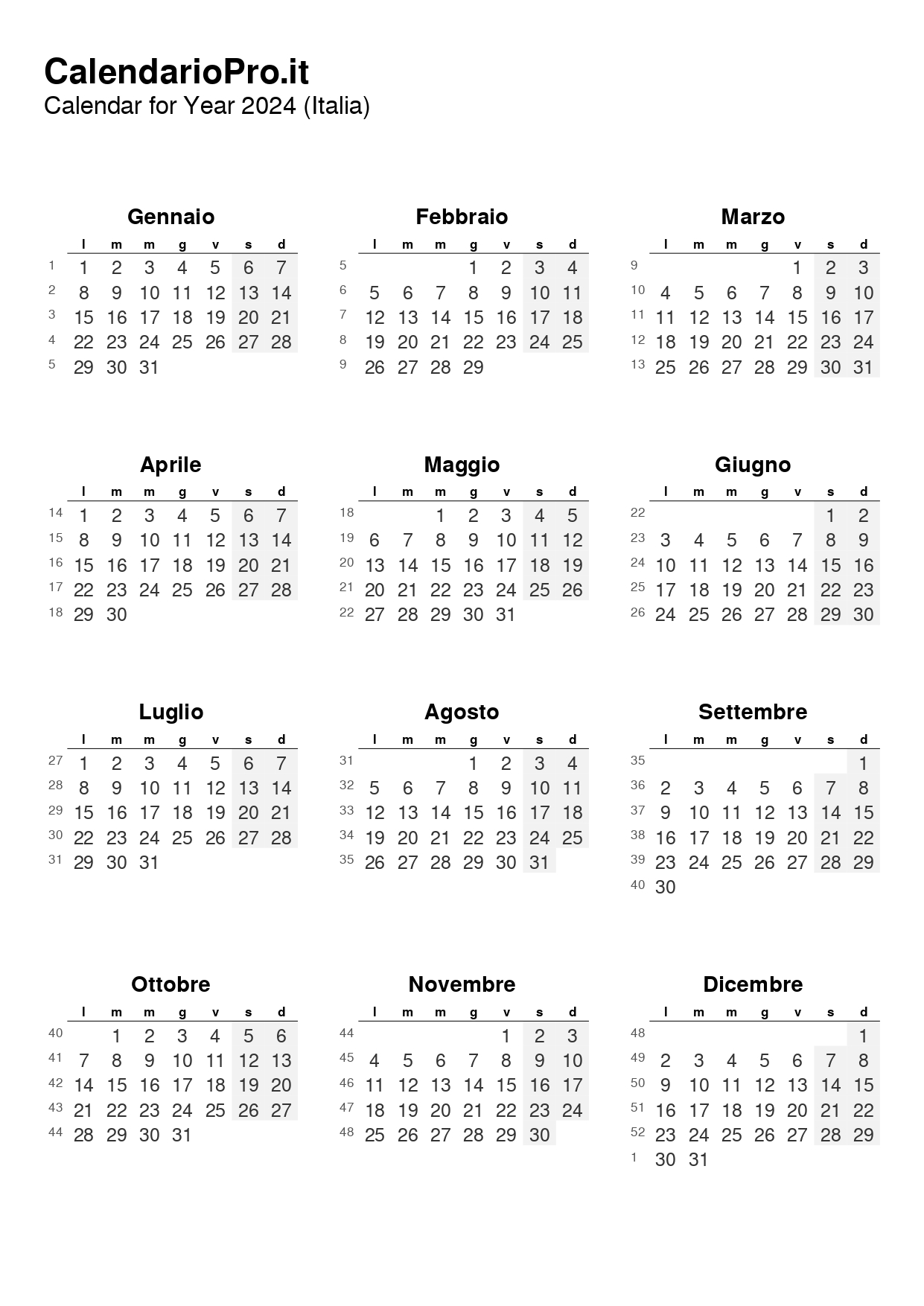 In questo modo hai tutti i giorni, i numeri delle settimane e le festività del 2024 sempre a portata di mano, in un formato ordinato, leggibile e facile da usare.