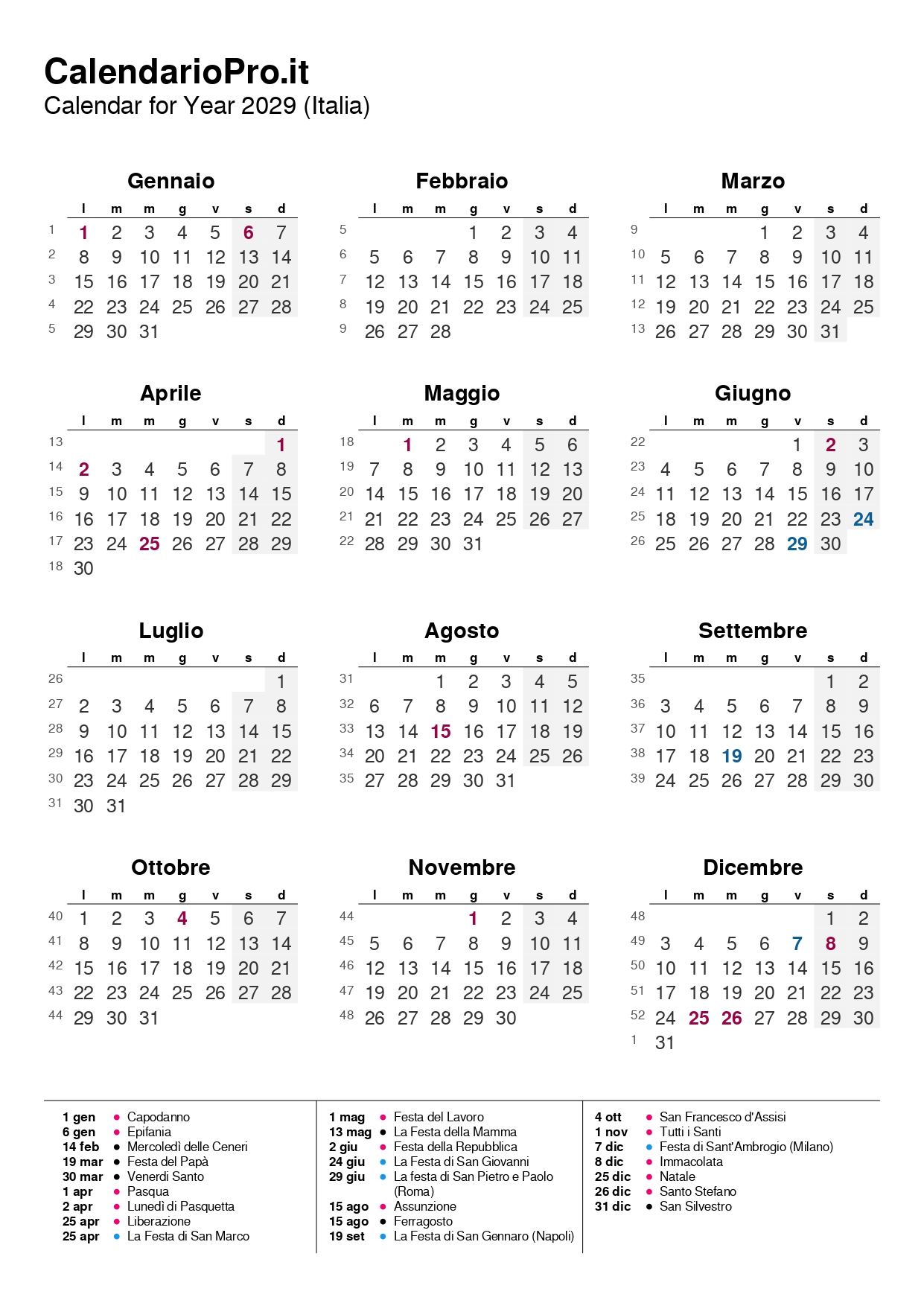 In questo modo hai tutti i giorni, i numeri delle settimane e le festività del 2029 sempre a portata di mano, in un formato ordinato, leggibile e facile da usare.