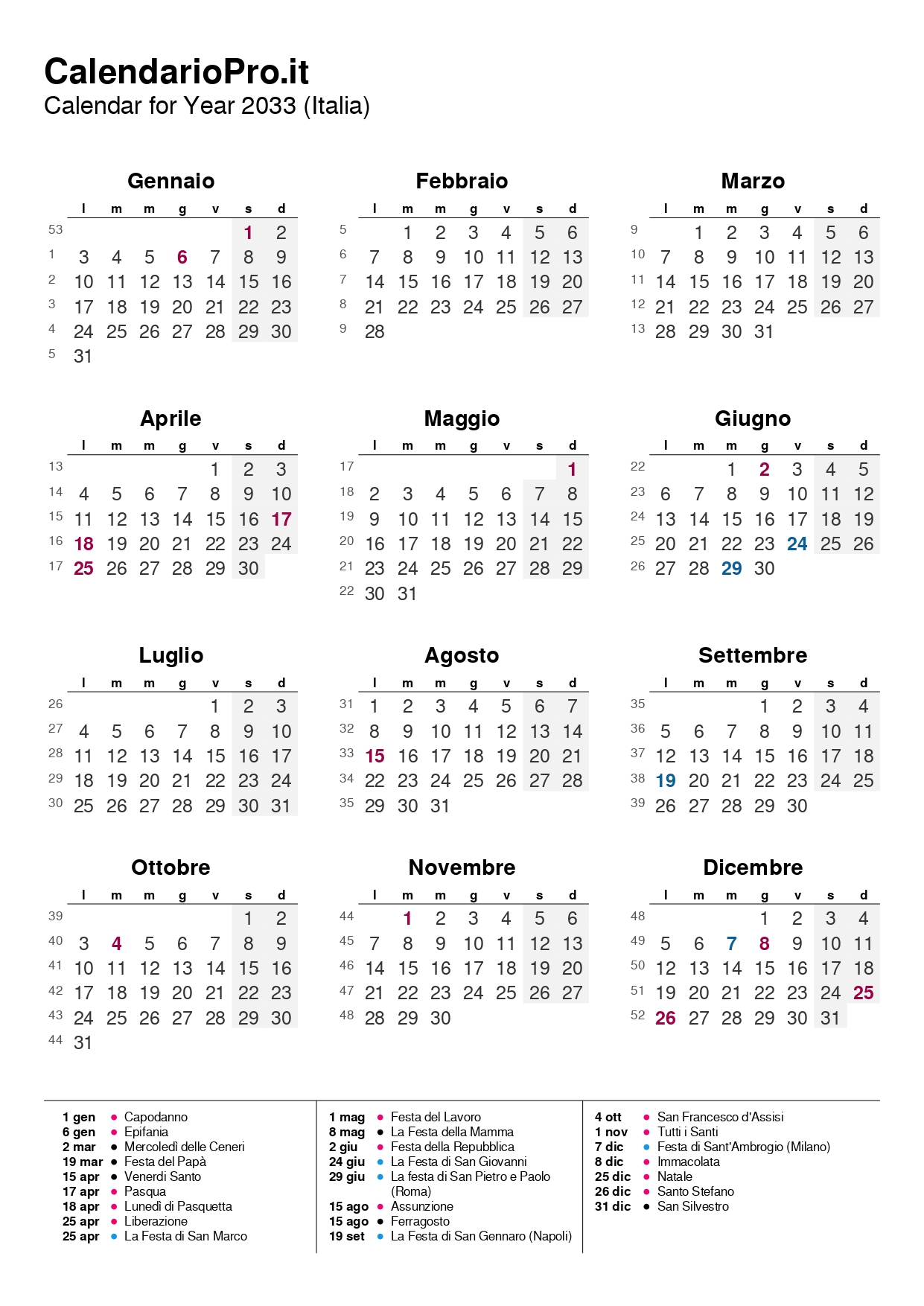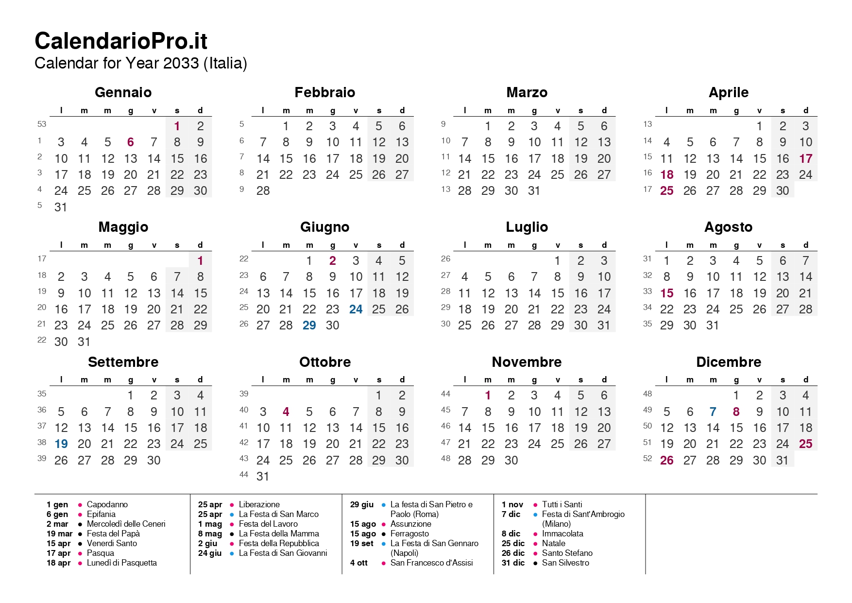 Calendario 2033 con Festività