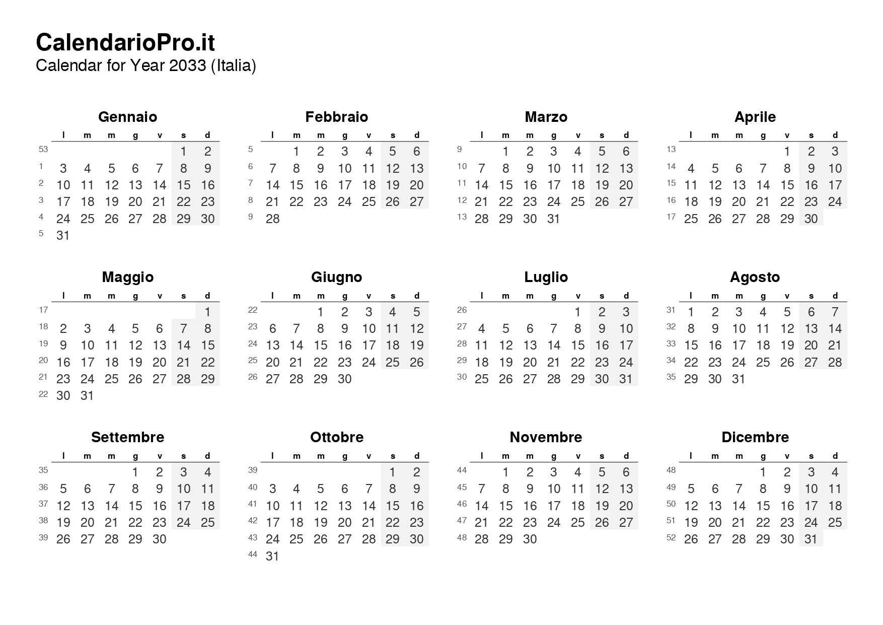 Scarica il Calendario mensile 2033 con Festività – Formato Orizzontale (12 Pagine)