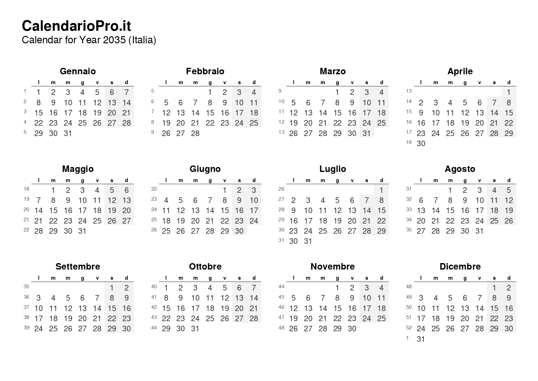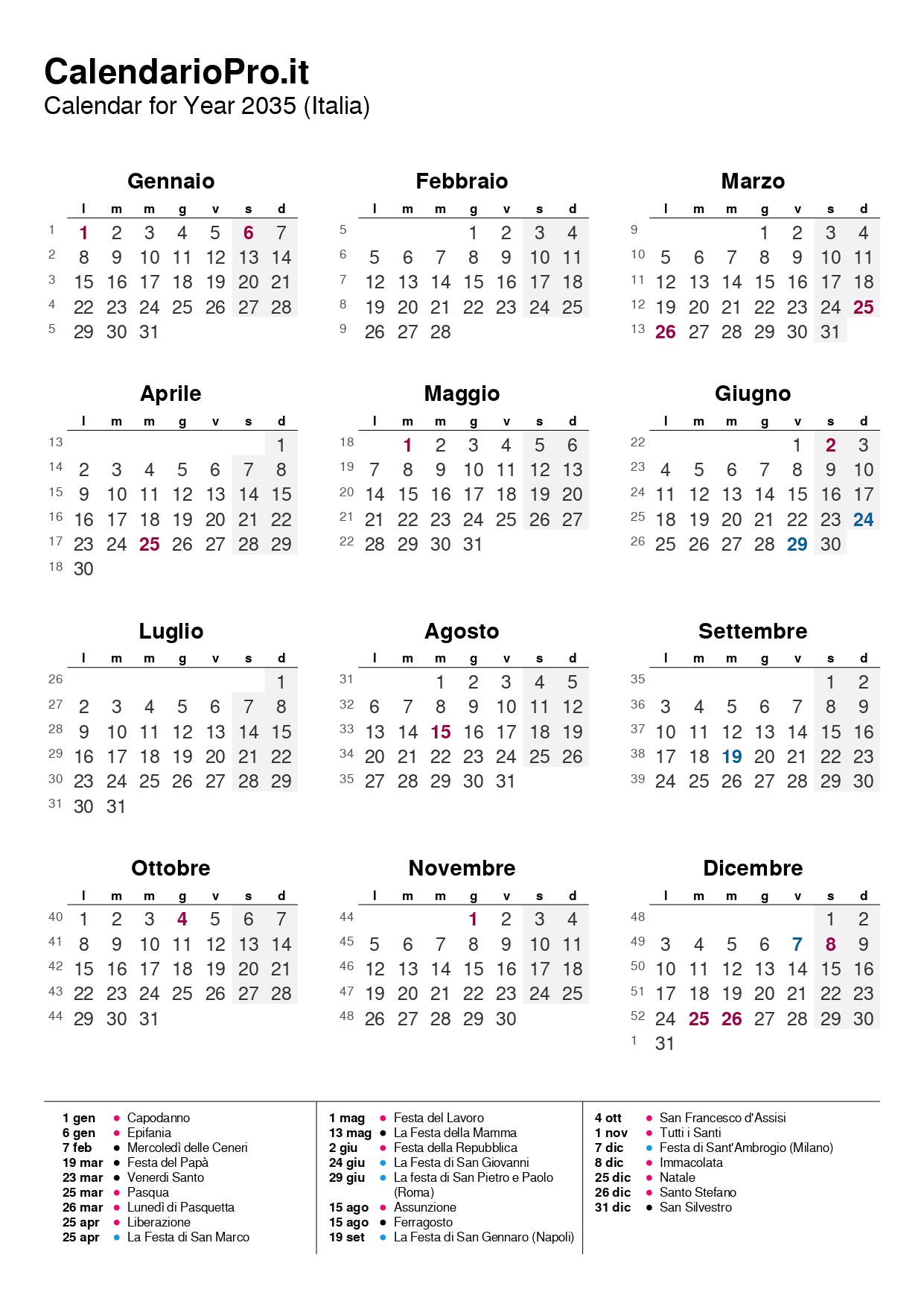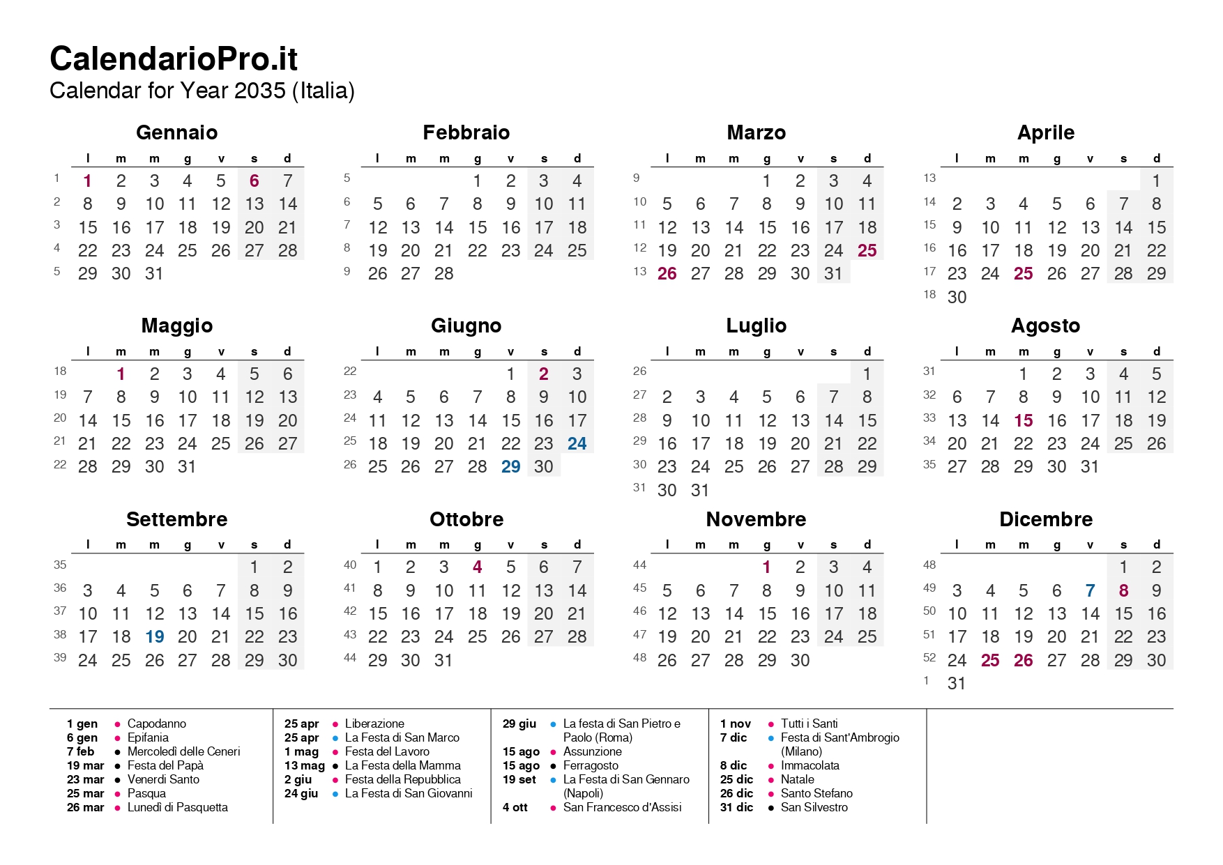 In questo modo hai tutti i giorni, i numeri delle settimane e le festività del 2035 sempre a portata di mano, in un formato ordinato, leggibile e facile da usare.