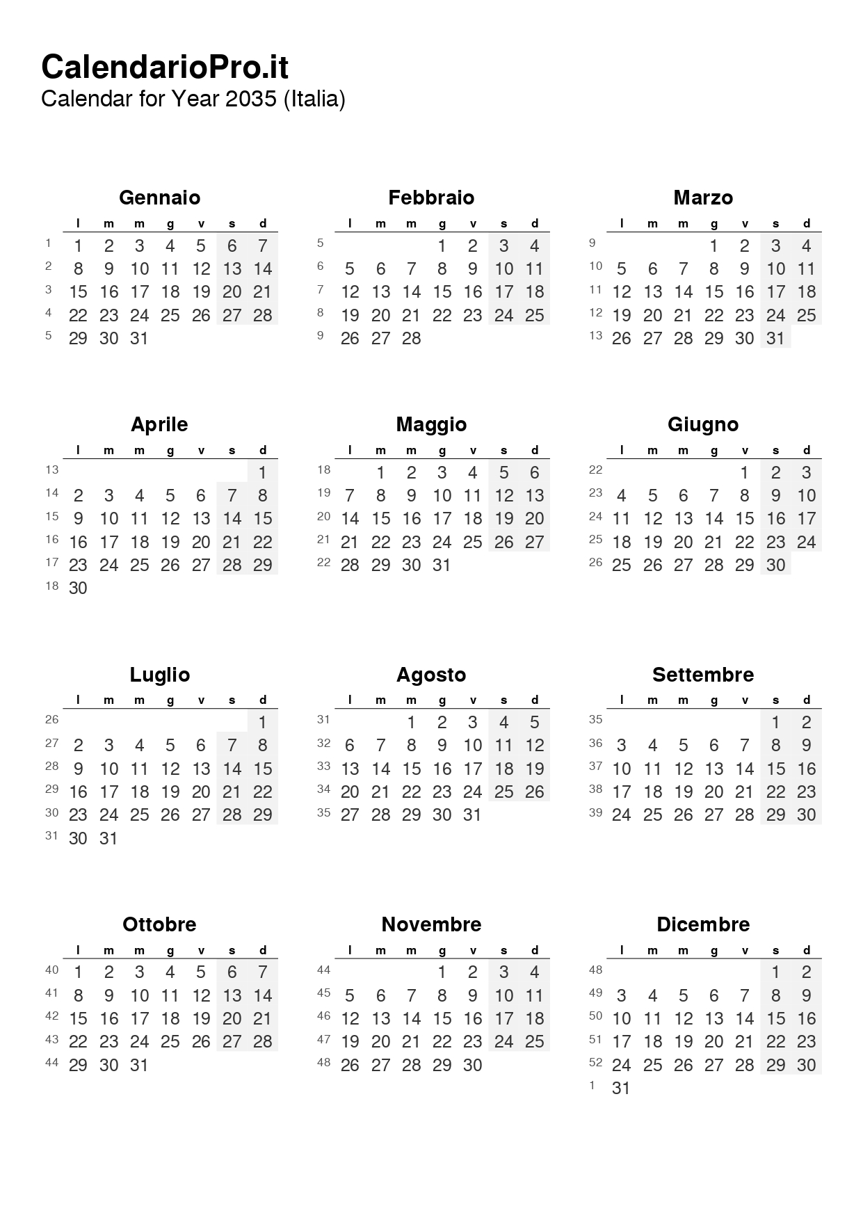Qui puoi scaricare gratuitamente il tuo calendario 2035 in formato PDF o JPG. È ideale come calendario da parete, calendario da scrivania o come pratico strumento di pianificazione quotidiana.