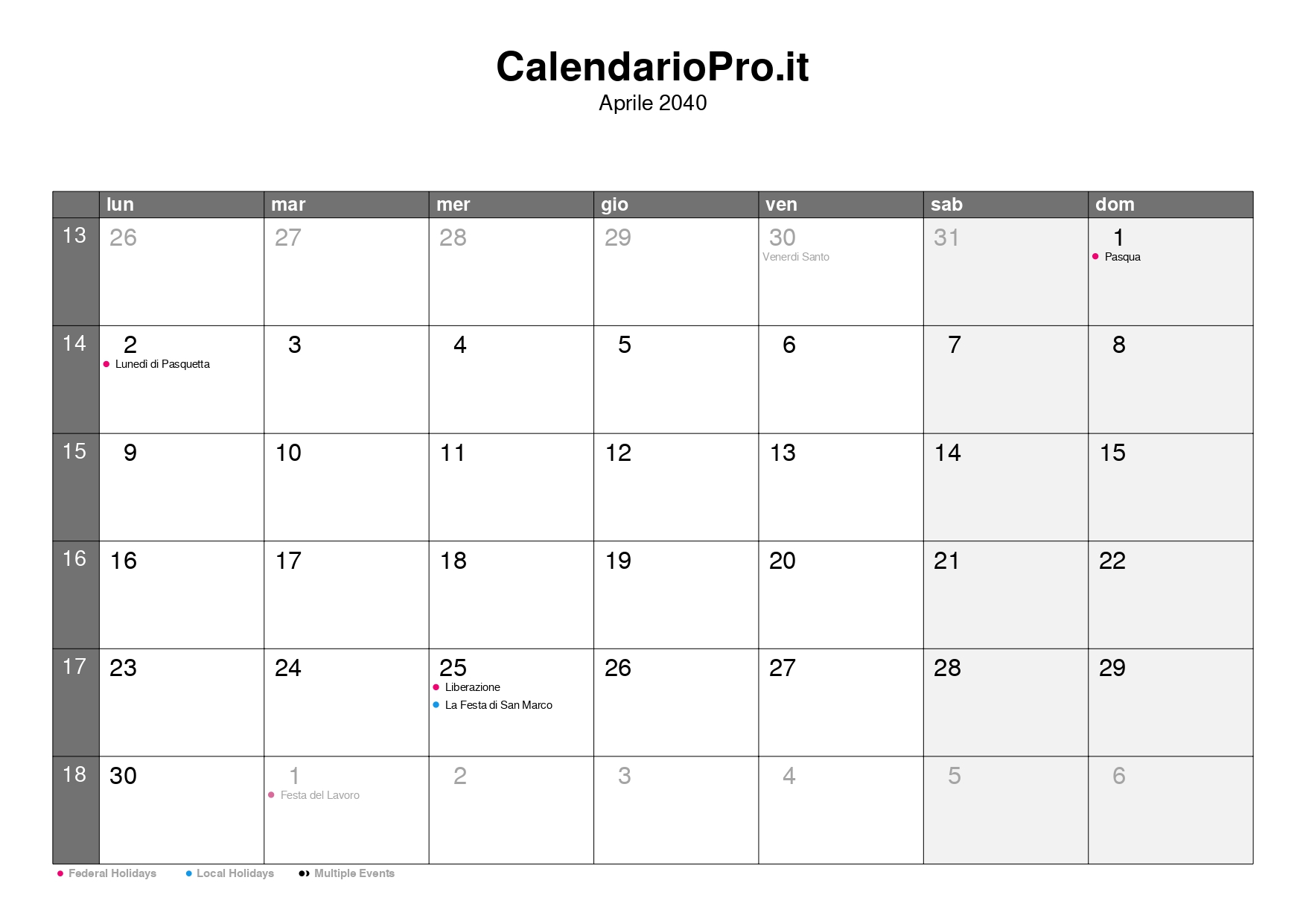 Consulta qui il calendario mensile di aprile 2040, con una panoramica completa di tutti i giorni, i numeri delle settimane e le festività.