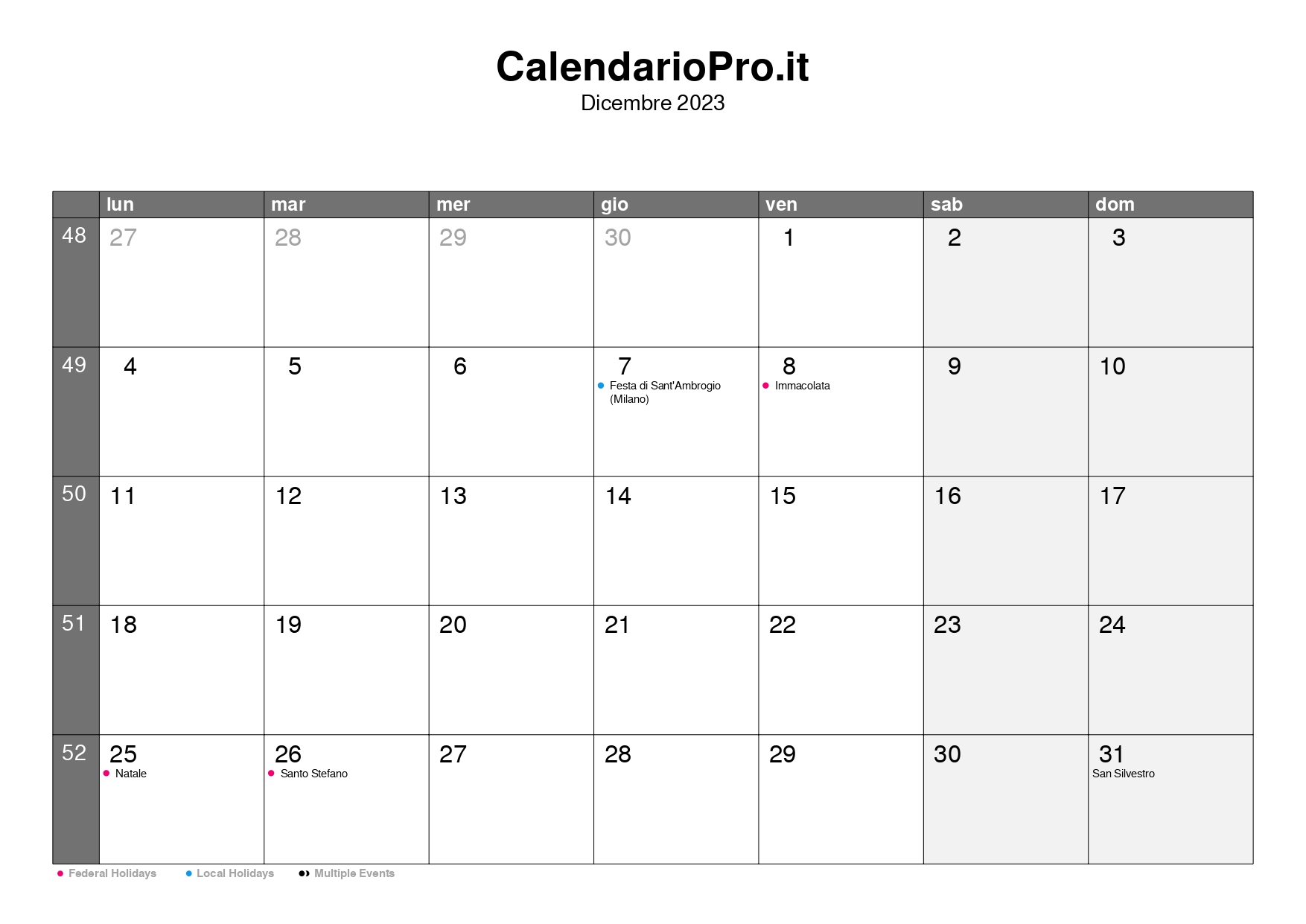 Questo calendario di dicembre 2023 è utile per vedere rapidamente quando cadono vacanze, giorni liberi o appuntamenti importanti.