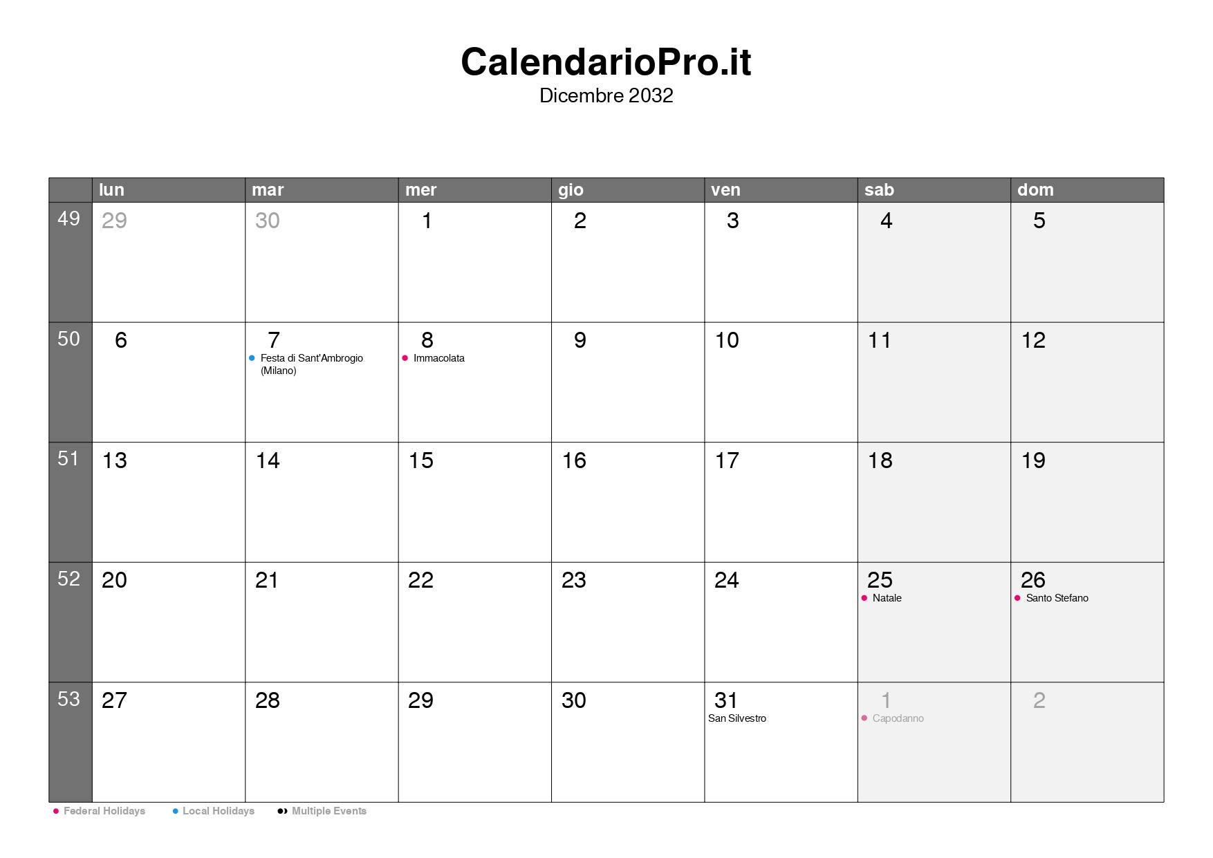 È utile per verificare rapidamente in che giorno cade una data o per preparare la tua pianificazione per il mese di dicembre 2032.