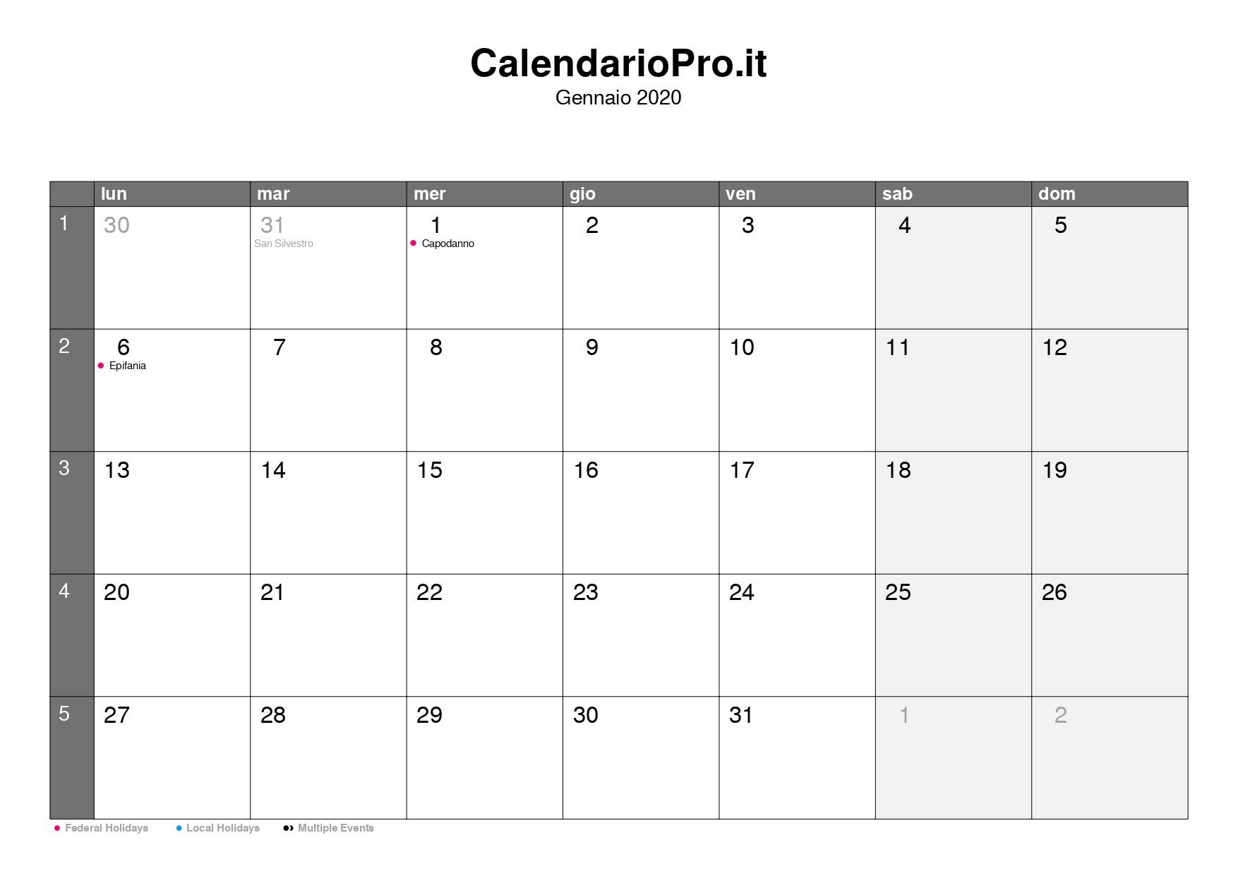 Questo calendario di gennaio 2020 è utile per vedere rapidamente quando cadono vacanze, giorni liberi o appuntamenti importanti.