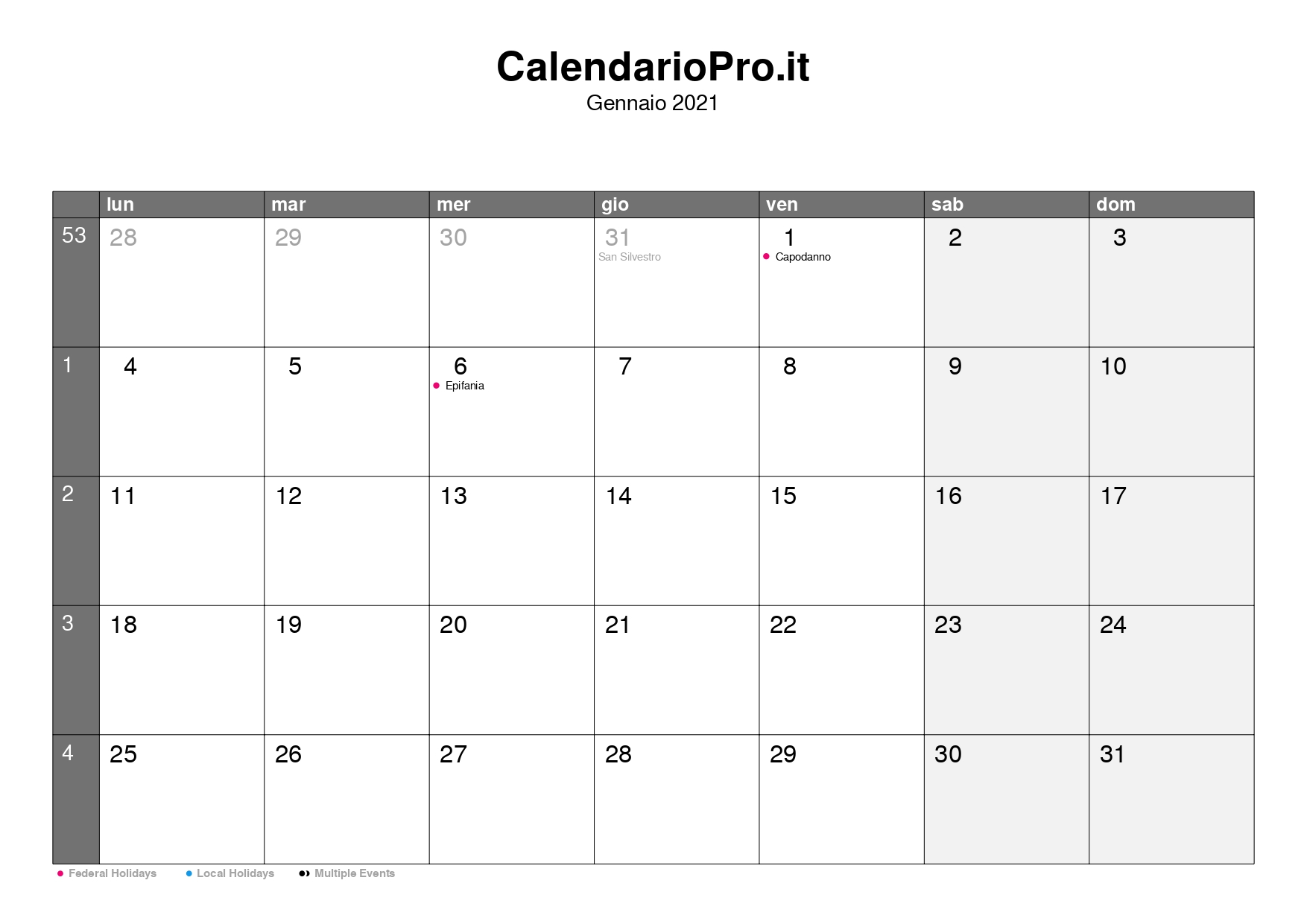 Consulta qui il calendario mensile di gennaio 2021, con una panoramica completa di tutti i giorni, i numeri delle settimane e le festività.