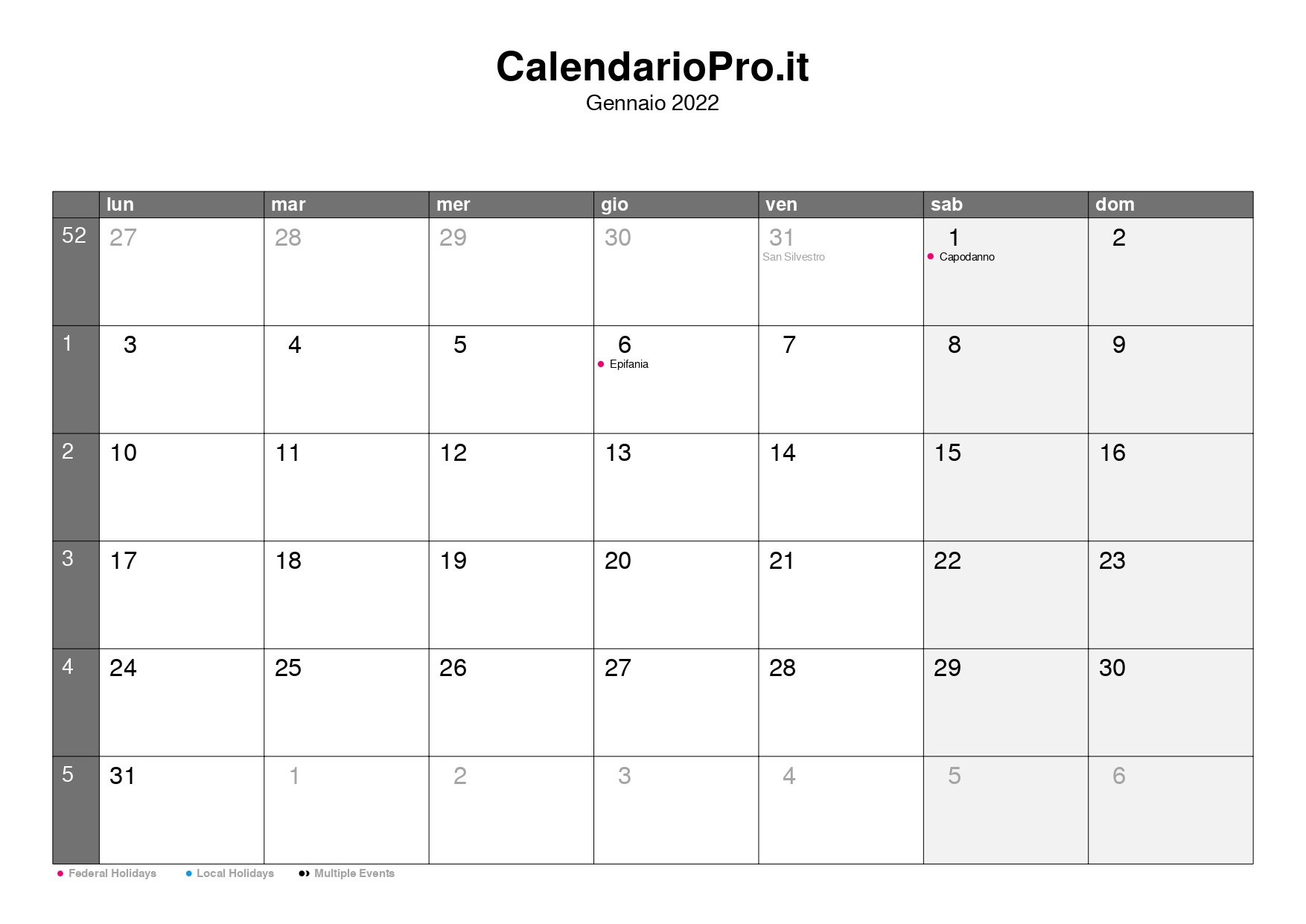 Questo calendario di gennaio 2022 è utile per vedere rapidamente quando cadono vacanze, giorni liberi o appuntamenti importanti.