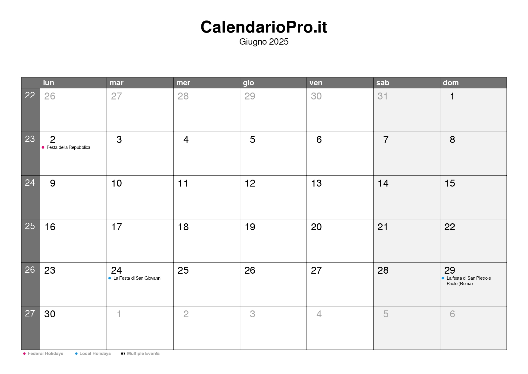 Consulta qui il calendario mensile di giugno 2025, con una panoramica completa di tutti i giorni, i numeri delle settimane e le festività.