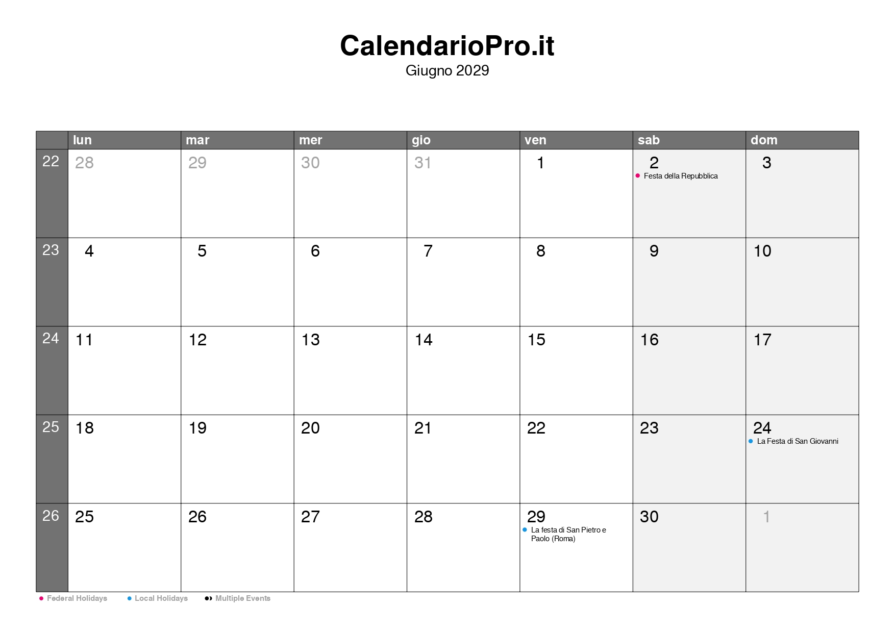 Calendario giugno 2029