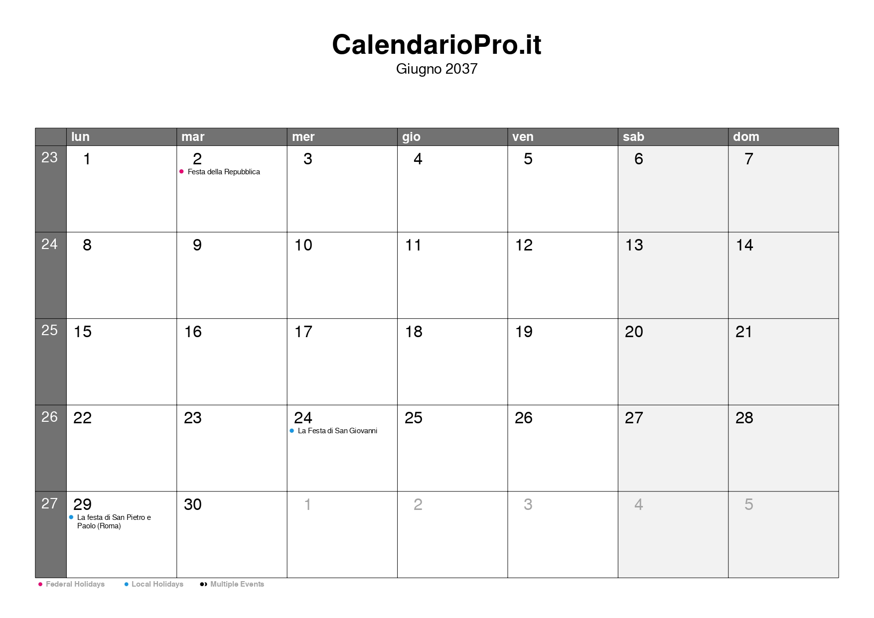 Consulta qui il calendario mensile di giugno 2037, con una panoramica completa di tutti i giorni, i numeri delle settimane e le festività.