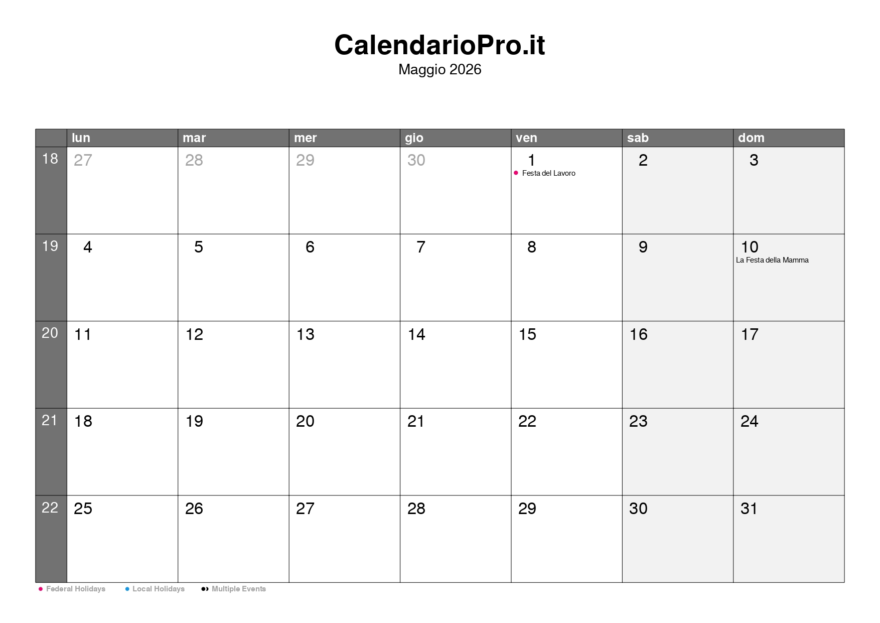 Consulta qui il calendario mensile di maggio 2026, con una panoramica completa di tutti i giorni, i numeri delle settimane e le festività.