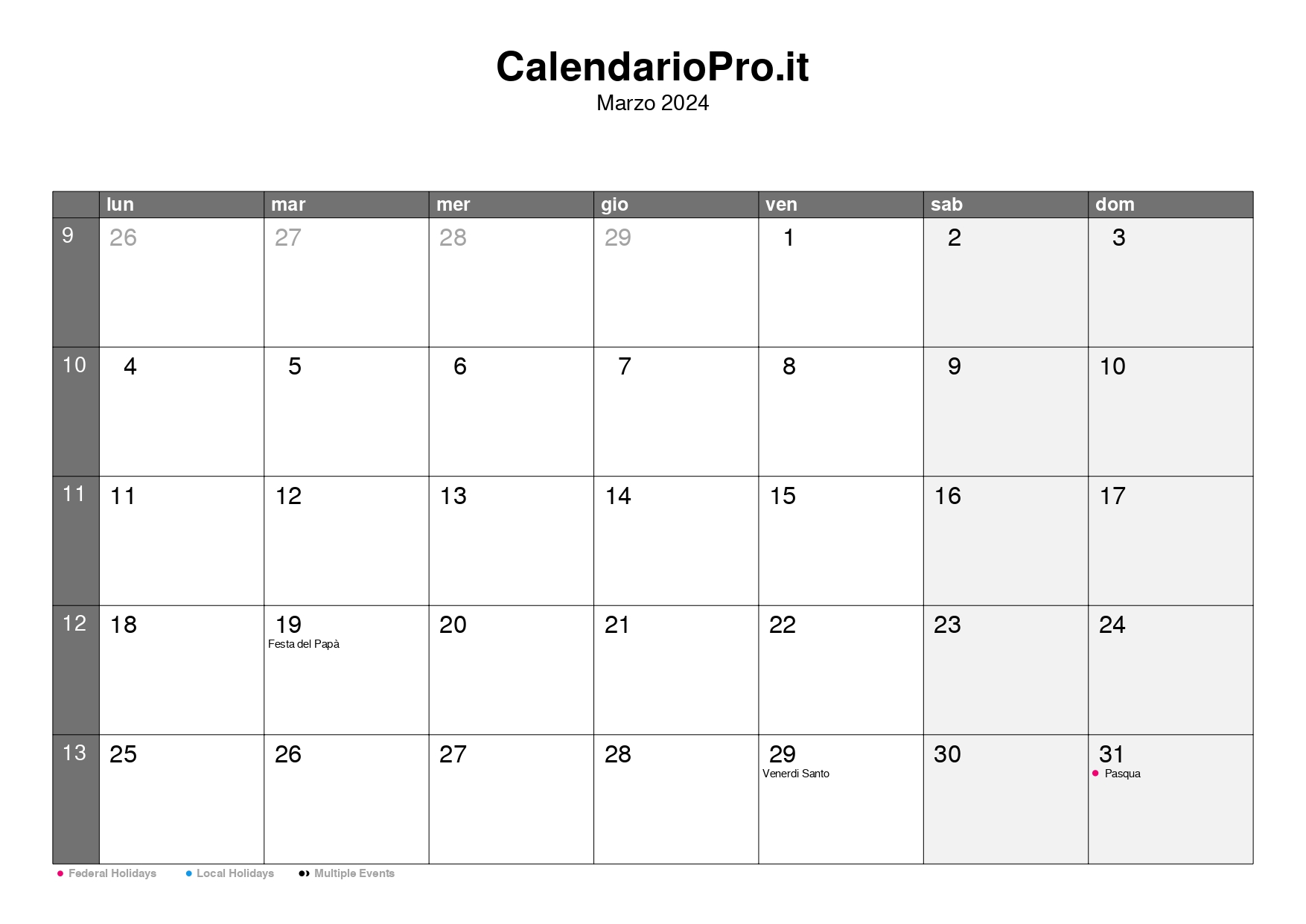 Consulta qui il calendario mensile di marzo 2024, con una panoramica completa di tutti i giorni, i numeri delle settimane e le festività.