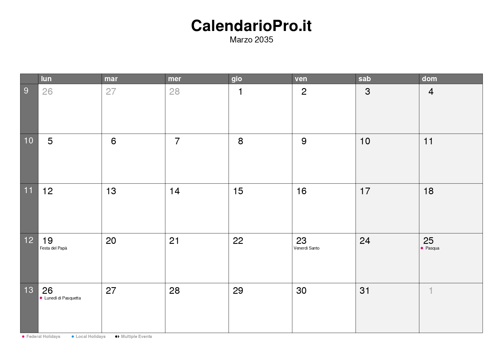 È utile per verificare rapidamente in che giorno cade una data o per preparare la tua pianificazione per il mese di marzo 2035.