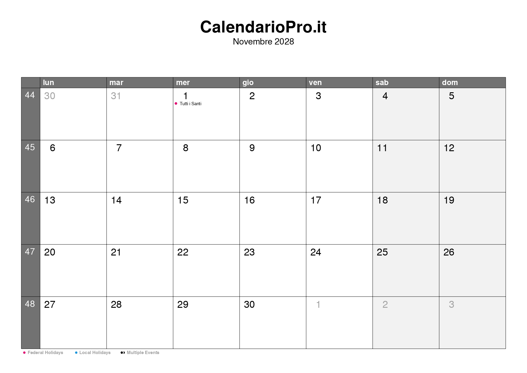 Consulta qui il calendario mensile di novembre 2028, con una panoramica completa di tutti i giorni, i numeri delle settimane e le festività.