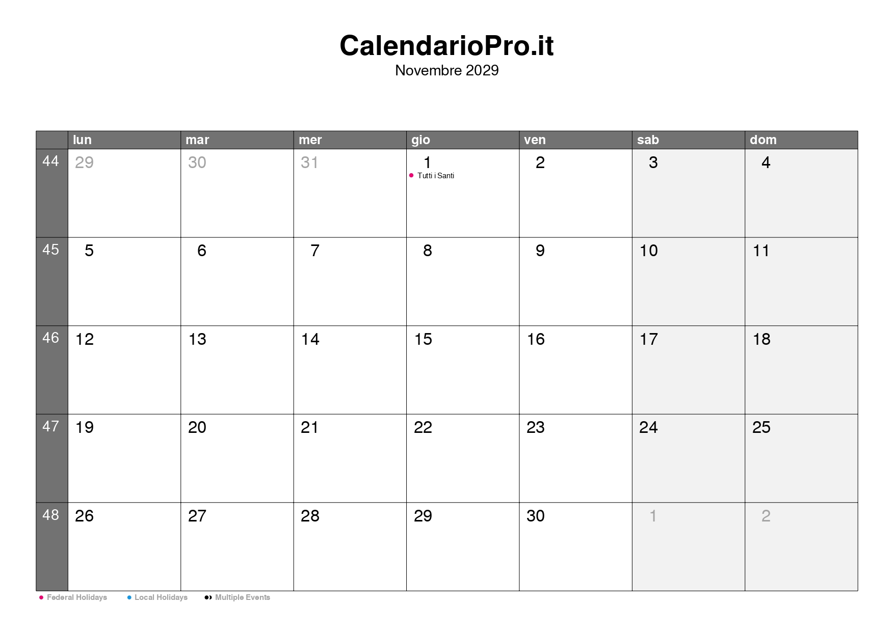 Consulta qui il calendario mensile di novembre 2029, con una panoramica completa di tutti i giorni, i numeri delle settimane e le festività.