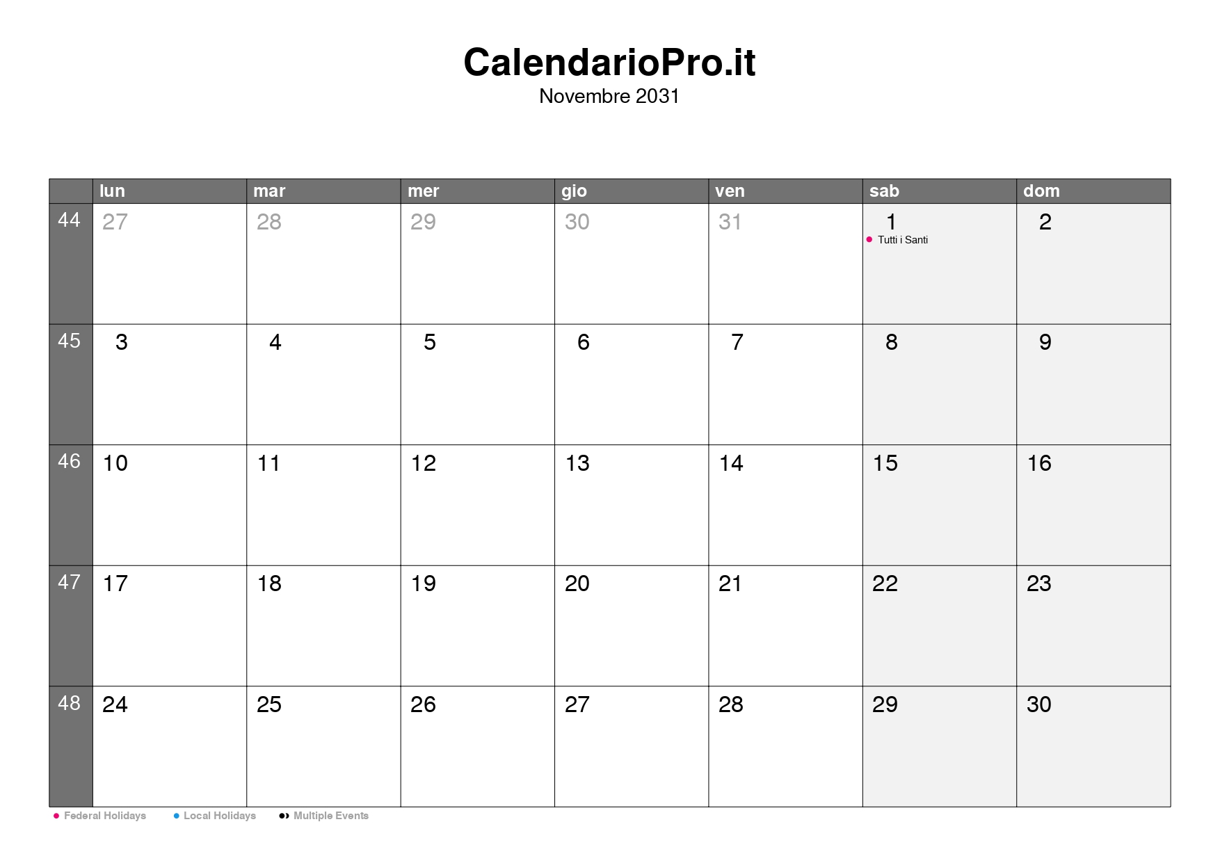 Consulta qui il calendario mensile di novembre 2031, con una panoramica completa di tutti i giorni, i numeri delle settimane e le festività.
