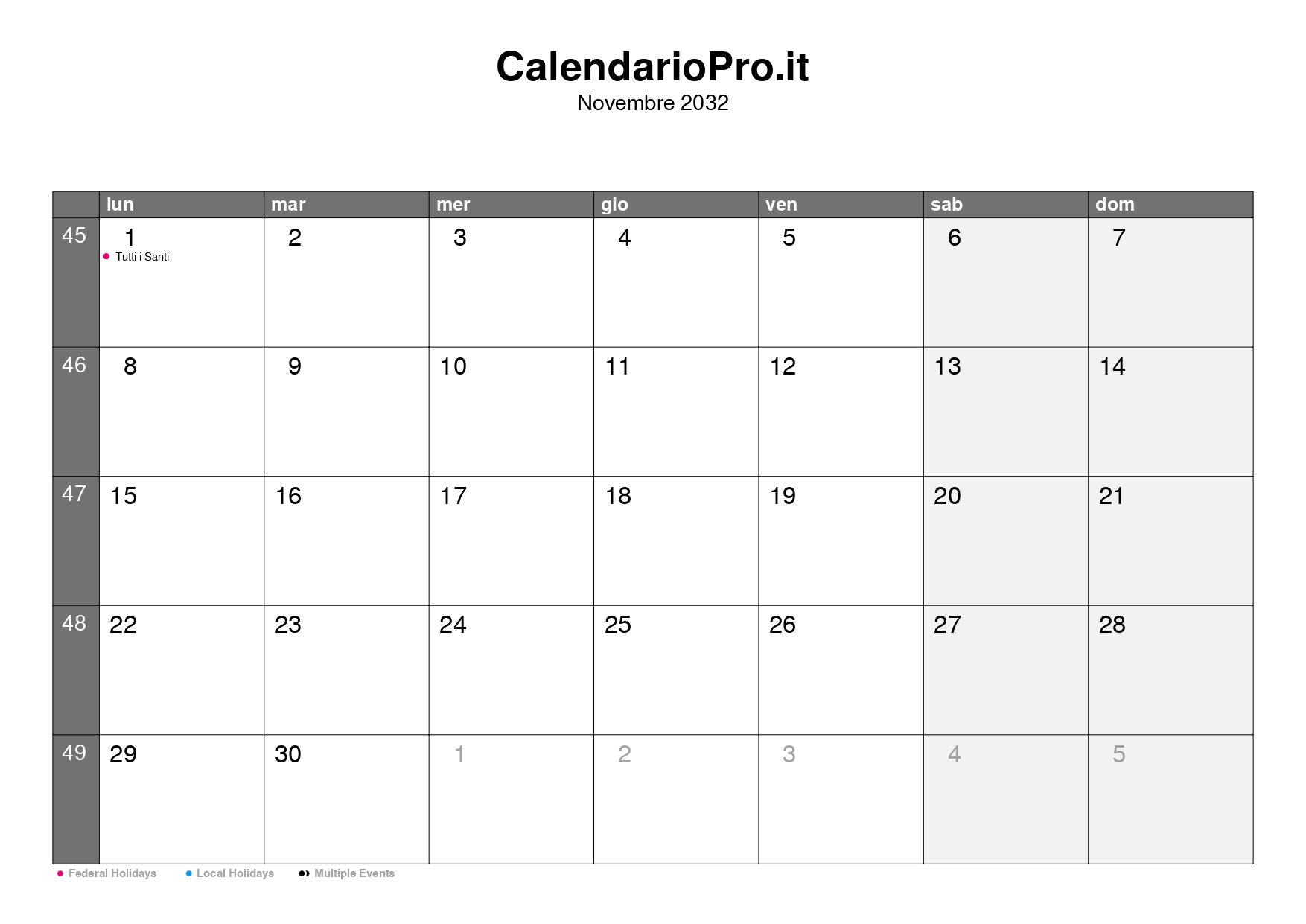 È utile per verificare rapidamente in che giorno cade una data o per preparare la tua pianificazione per il mese di novembre 2032.